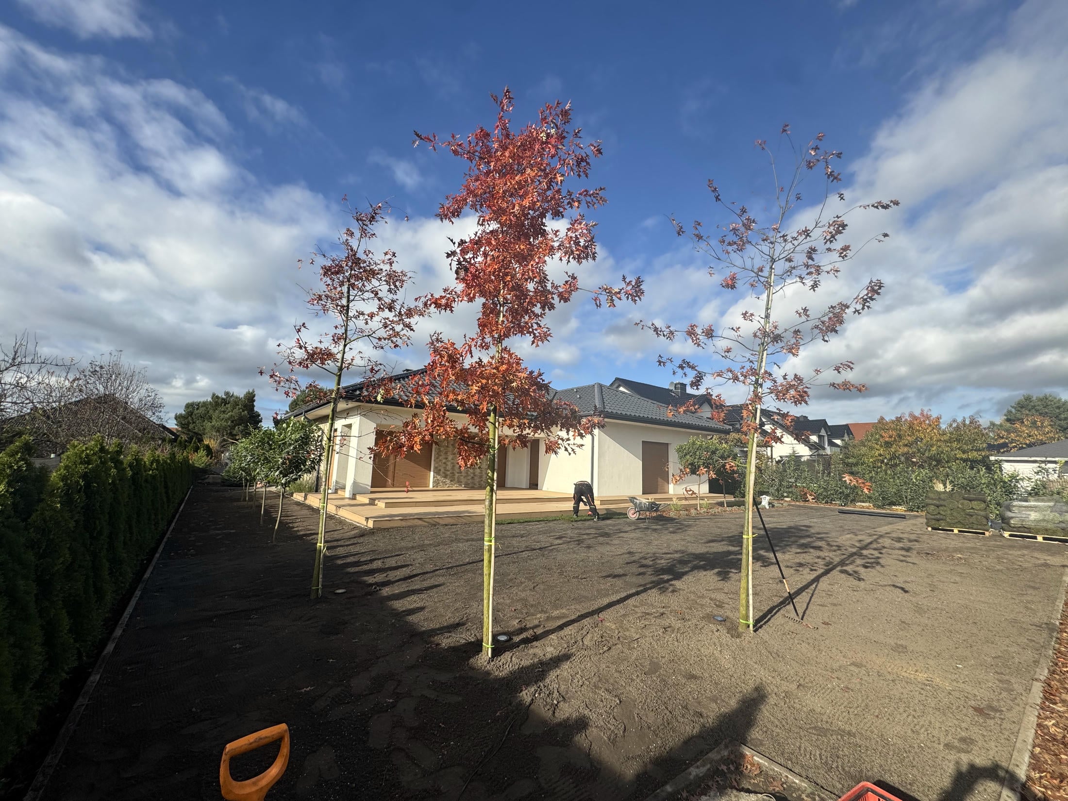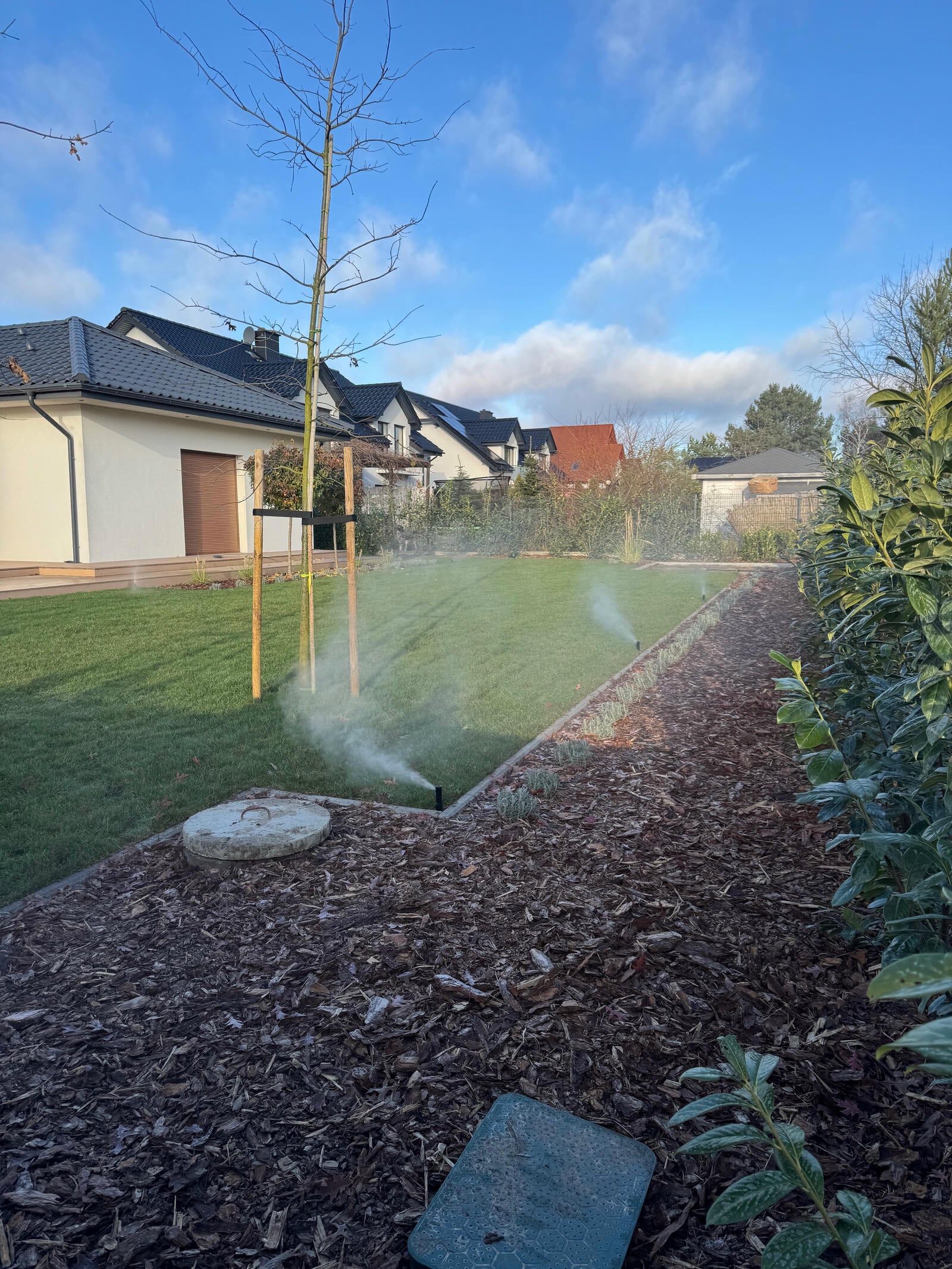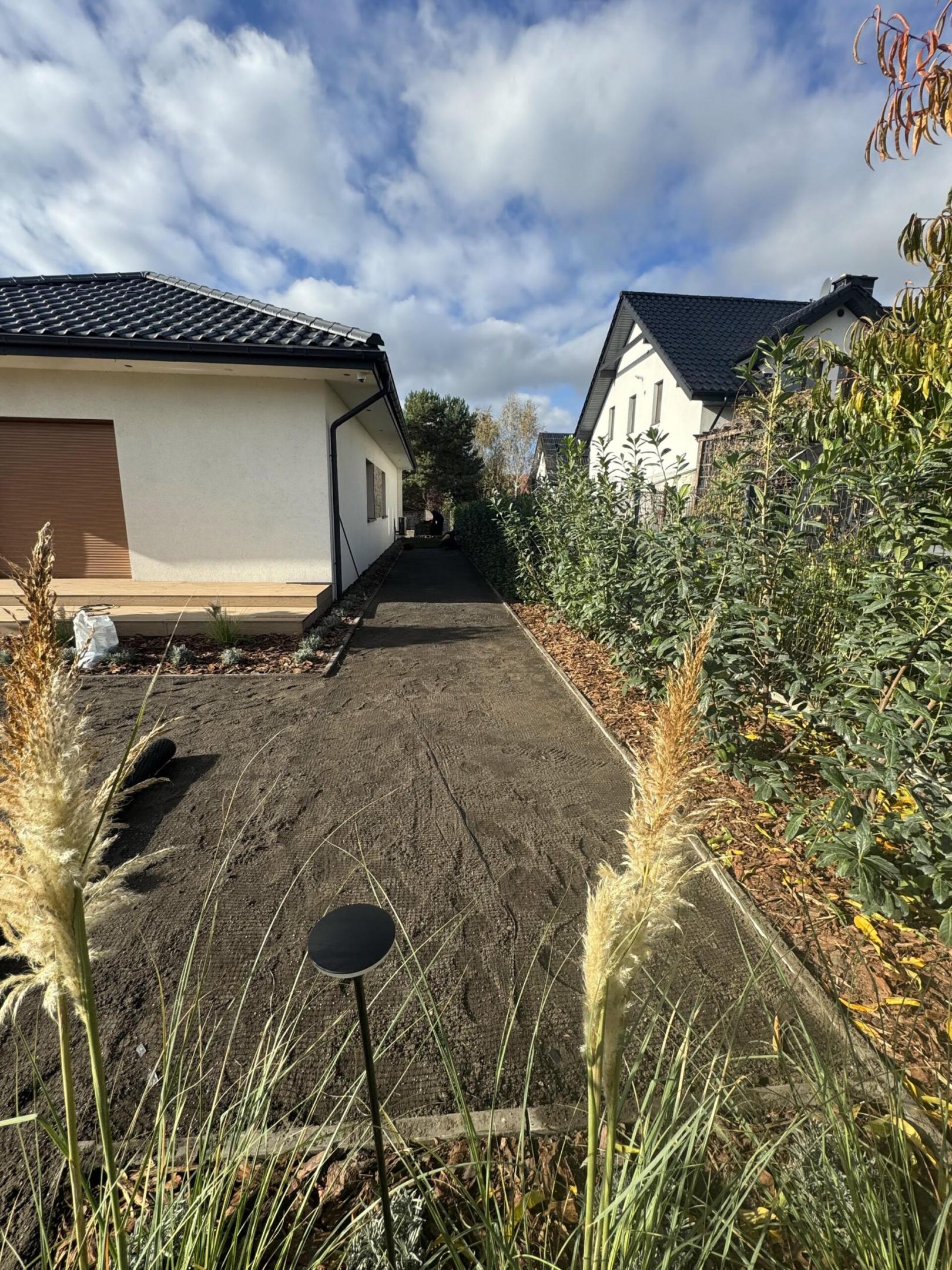 Na progu jesieni zakończyliśmy kompleksową realizację ogrodu, nad którym pracowaliśmy etapami od wiosny. Wykonaliśmy tu duży taras wychodzący wgłąb ogrodu, system nawadniający, położyliśmy trawnik z rolki, a także siatkę na kreta i posadziliśmy mnóstwo pięknych drzew i kwiatów.
