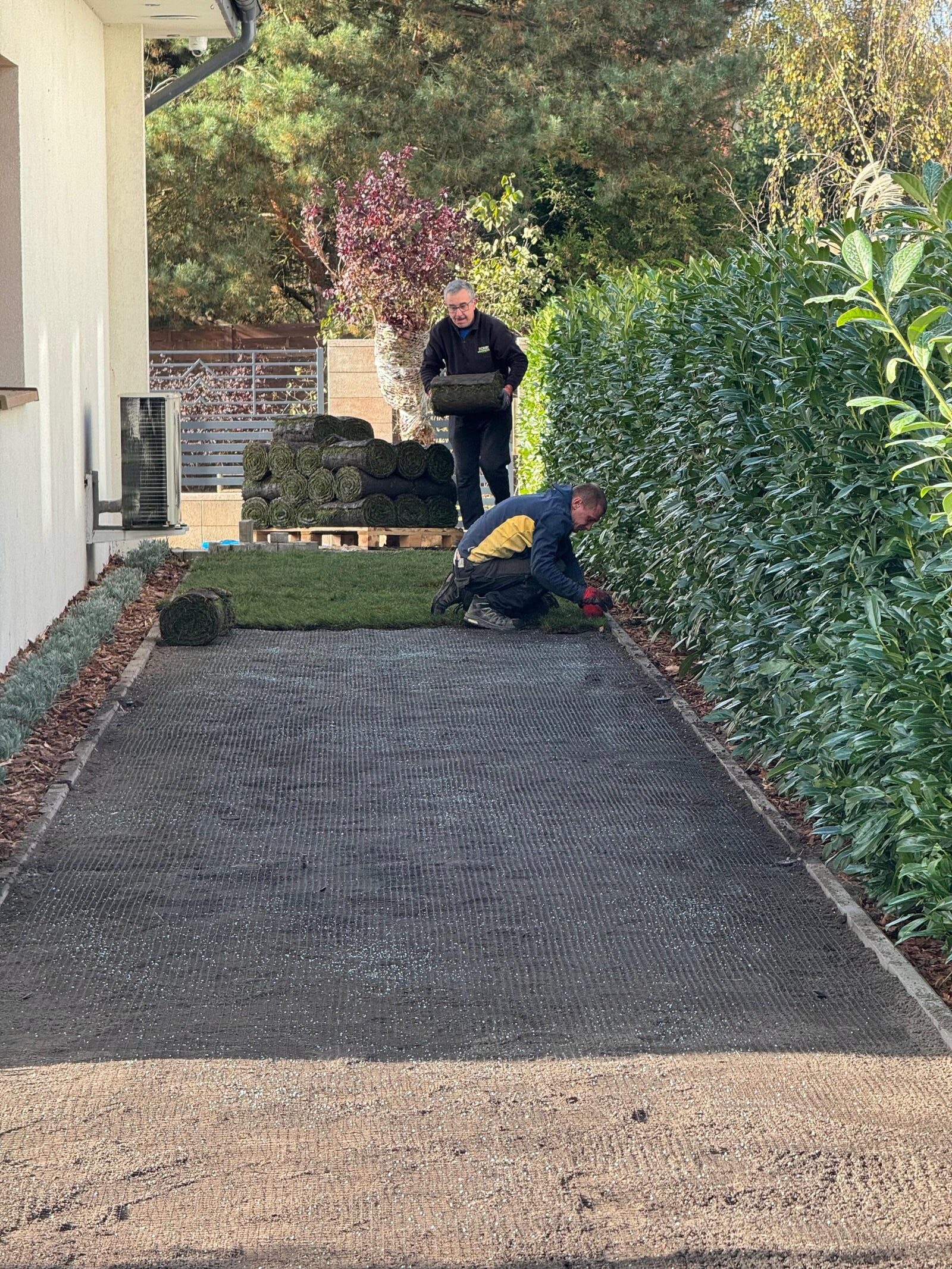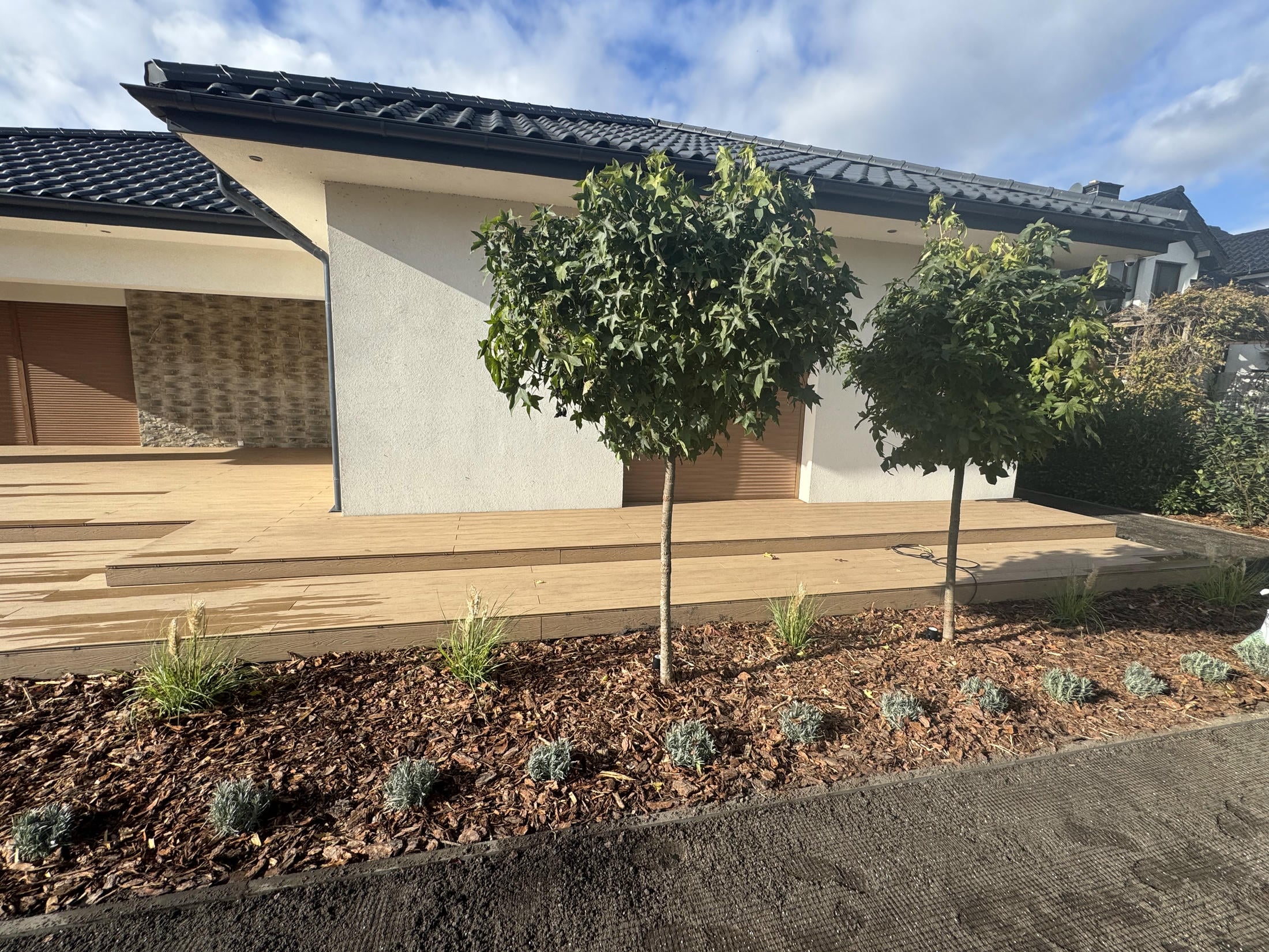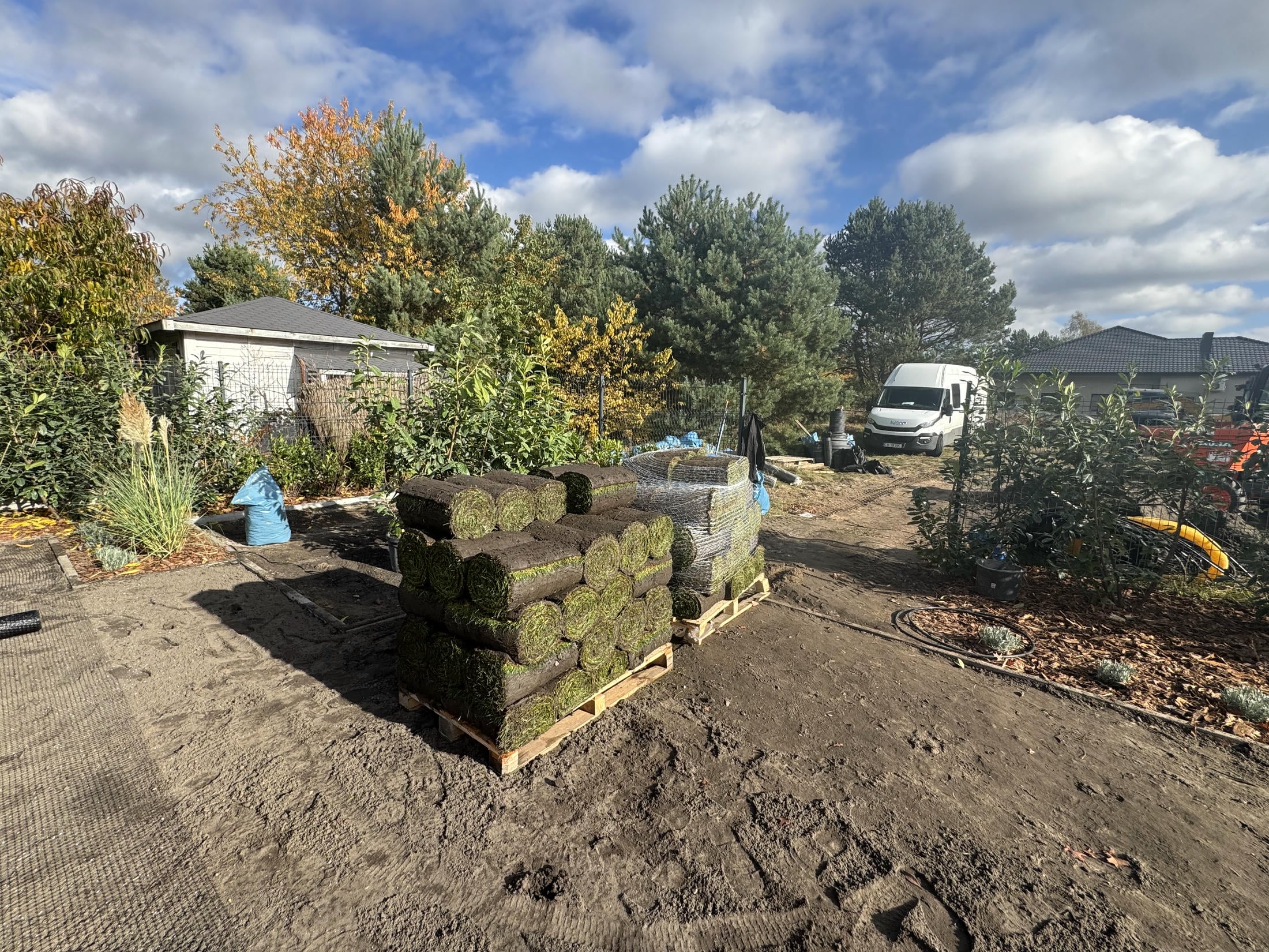 Na progu jesieni zakończyliśmy kompleksową realizację ogrodu, nad którym pracowaliśmy etapami od wiosny. Wykonaliśmy tu duży taras wychodzący wgłąb ogrodu, system nawadniający, położyliśmy trawnik z rolki, a także siatkę na kreta i posadziliśmy mnóstwo pięknych drzew i kwiatów.